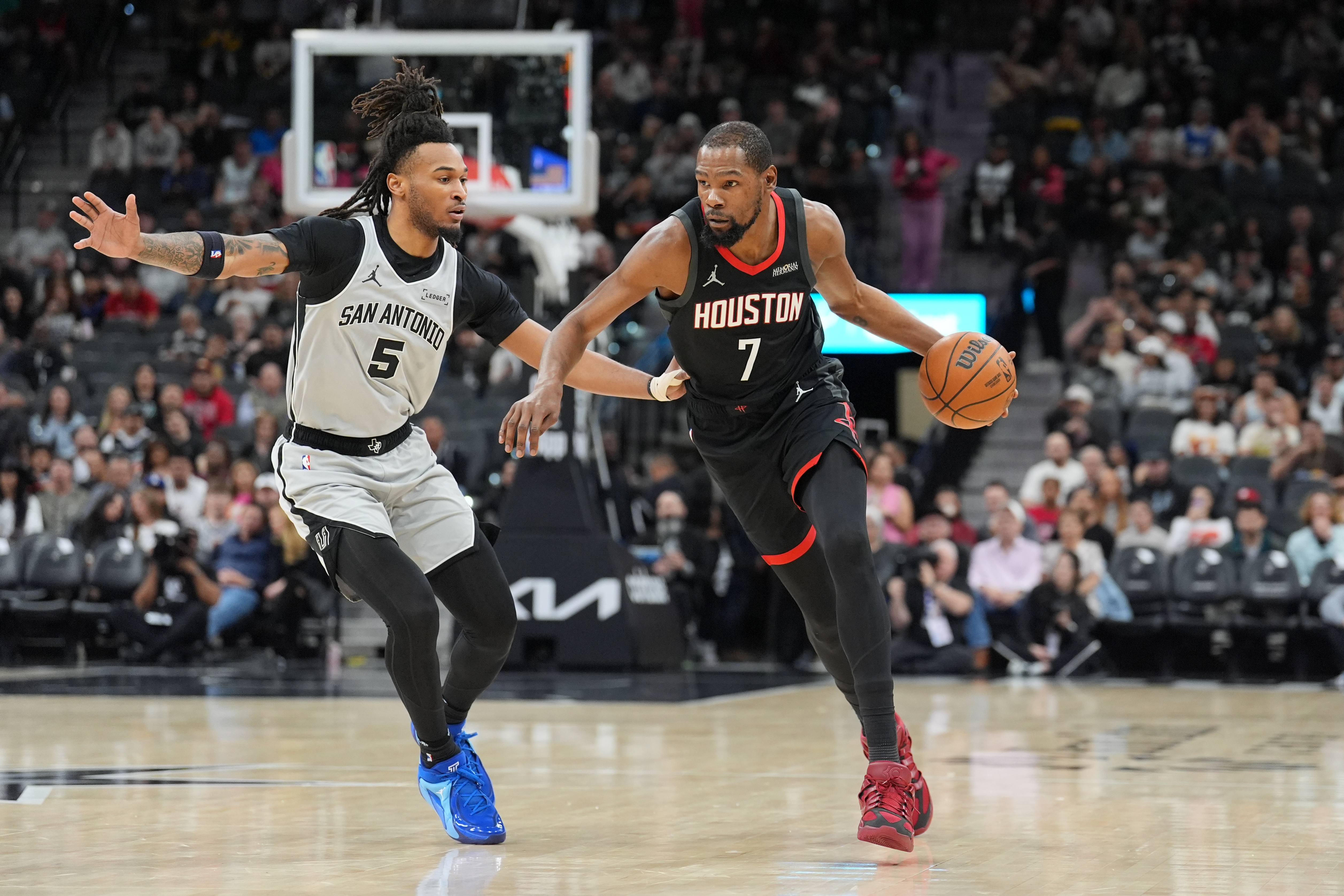两队风格截然不同:马刺是现代型突破+三分投射打法,节奏快,空间好,投射火力汹涌;火箭更依赖杜兰特、申京、阿门的中近距离作业,莽杀流打法,空间便秘,杜兰特被无限包夹,全队依靠活力和血气撑场。